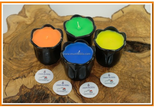 Lale Mumluk Set. Ham maddesi taş tozudur, içi ve dışı boyanmıştır. İçlerine renkli mum dökülmüştür. Tamamen el işçiliği ile üretilmiştir.