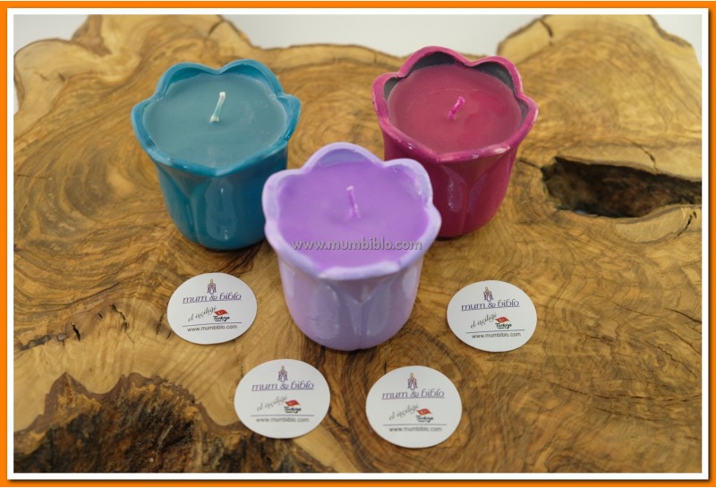 Lale Mumluk Set. Ham maddesi taş tozudur, içi ve dışı boyanmıştır. İçlerine renkli mum dökülmüştür. Tamamen el işçiliği ile üretilmiştir.